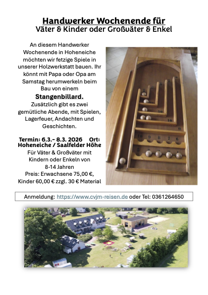 Das Handwerker-Wochenende in Hoheneiche lädt dich ein, kreativ zu werden und gemeinsam mit Papa oder Opa etwas Eigenes zu schaffen. In unserer Holzwerkstatt bauen wir am Samstag interessante Spiele – mit Werkzeugen, Holz und einer großen Portion handwerklichem Spaß. Egal, ob du lieber mit den Händen arbeitest oder mit den Holzverarbeitungsmaschinen – hier kannst du dich richtig austoben.