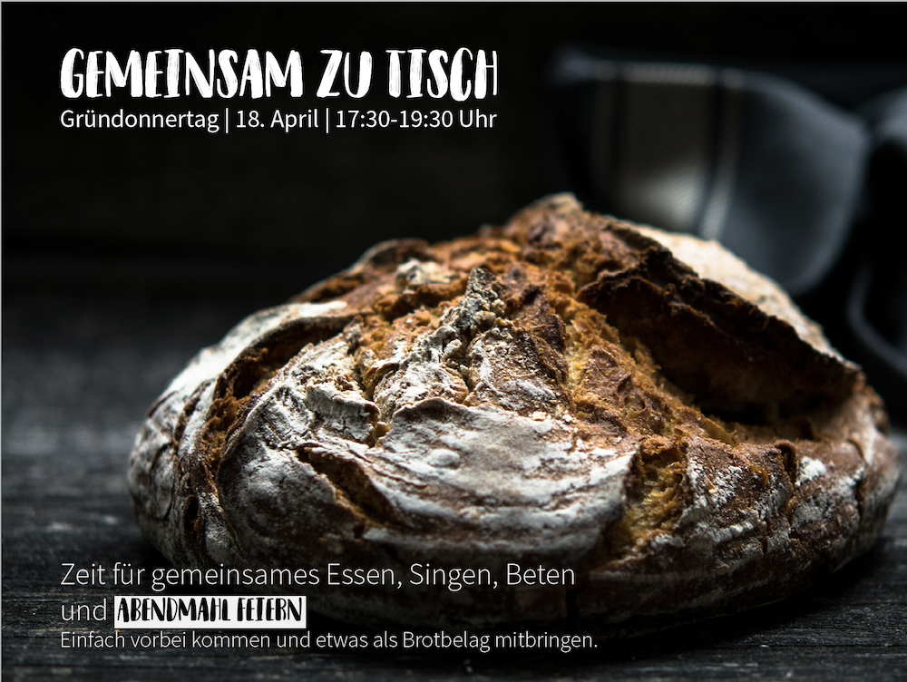Am Gründonnerstag (18.04.19) ist es Zeit für Gemeinschaft am Tisch. In der Zeit von 17:30 bis 19:30 Uhr wollen wir gemeinsam Essen, Singen, Beten und das Abendmahl feiern. Brot wird es dafür geben. Du darfst gern noch Belag oder Aufstrich mitbringen.