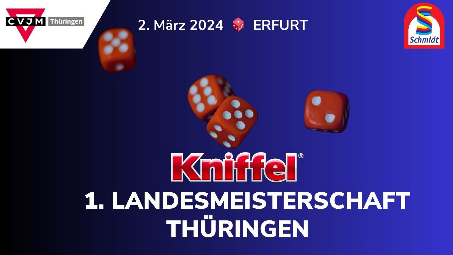 Im CVJM Thüringen findet dieses Jahr ein Event der besonderer Art statt. Gemeinsam mit Schmidt-Spiele veranstalten wir die 1. Landesmeisterschaft im Kniffel®. Eingeladen sind Kinder und Erwachsene ab 8 Jahre, die Lust haben, dieses Würfelspiel zu spielen. Maximal können 80 Personen teilnehmen.